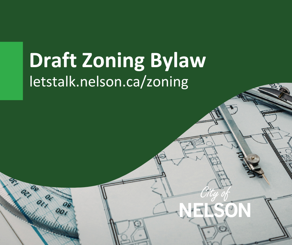 Residents are invited to review the draft Zoning Bylaw at letstalk.nelson.ca/zoning and share their input. Comments will be accepted until Friday, February 13 at 4 pm. The draft Zoning Bylaw will be presented to Council for the first and second reading at the Regular Council meeting on Tuesday, March 3.